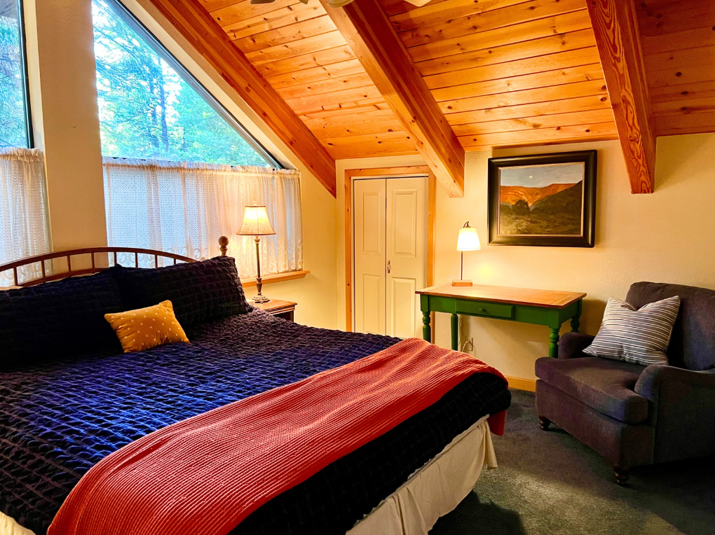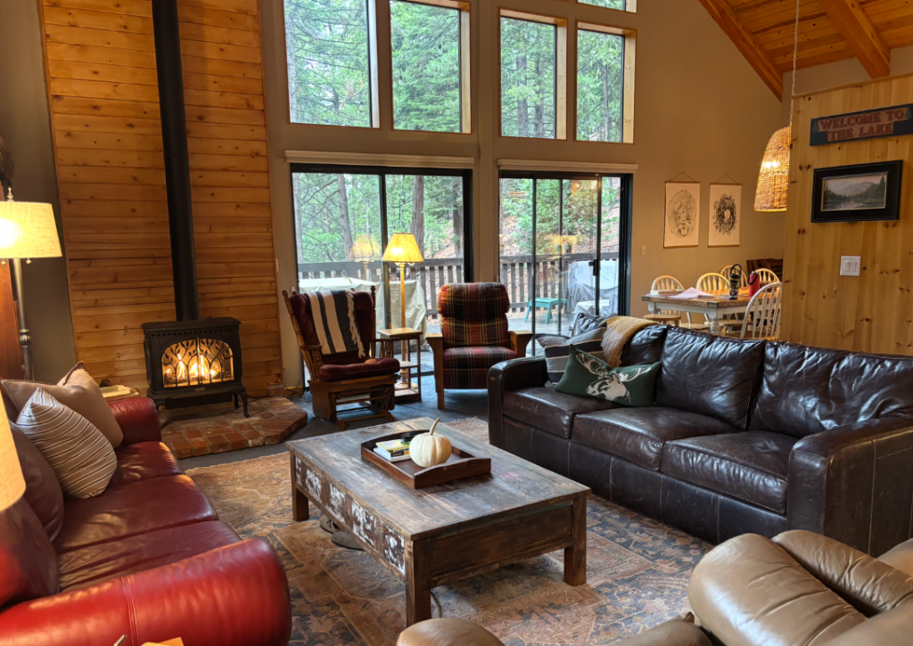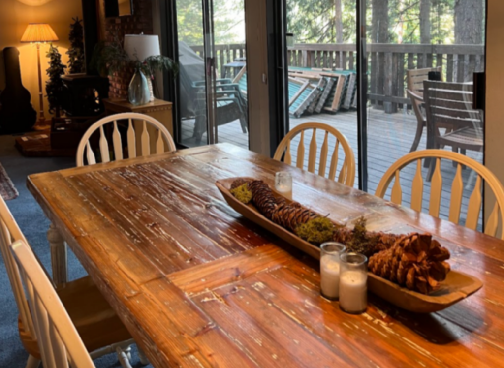 The deck (main level) looks out over empty forested land and across to sunshine mountain. The outdoor dining table seats 8-10.